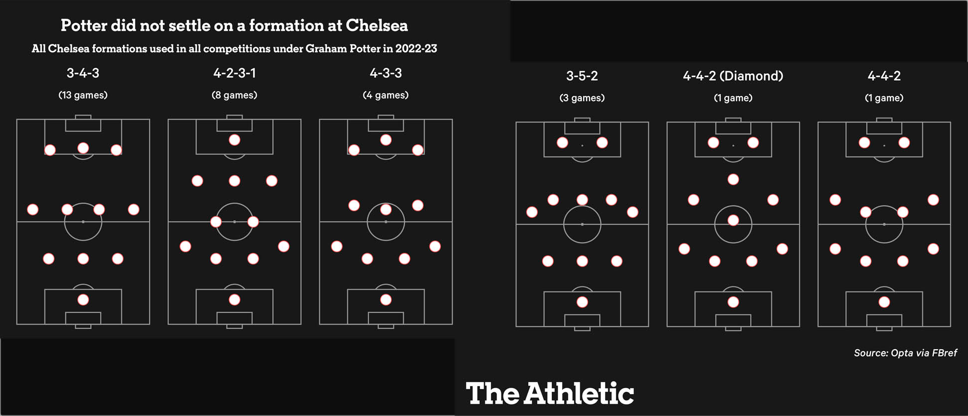 Og hver var svo afraksturinn af kaupæðinu þetta fyrsta heila tímabil 2022-23? Chelsea endaði í 12. sæti í deildinni og hefur aldrei lent neðar sl. 30 ár í Úrvalsdeildinni. Mourinho/Hiddink enduðu í 10. sæti með liðið 2015-16 en öll önnur ár frá 1995-96 hefur Chelsea aldrei lent neðar en í 6. sæti fyrr en Móri/Hiddink og Potter/Lampard komu að málum. Grínið er þó að Chelsea varð Englandsmeistari (Mourinho) 2014-15 tímabilið og síðan aftur 2016-17 eða ári eftir “Móri Horribilis”. En áfram með Potter/Lampard og þeirra afrek þetta tímabil. Chelsea var hent út úr báðum bikarkeppnunum í þriðju umferð eða fyrir áramót en komst í fjórðungsúrslit í Evrópukeppninni. Potter var látinn fara í byrjun apríl og Lampard tók við. Potter var búinn að reyna allar gerðir af leikskipulagi (sjá mynd) og nokkra til viðbótar en ekki gekk rófan. Lampard gat því miður engu bjargað það sem eftir lifði vetrar og liðið tapaði 8 leikjum, gerði 2 jafntefli og vann einn leik undir hans stjórn. Chelsea skoraði aðeins 38 mörk í Úrvalsdeildinni þetta tímabil.